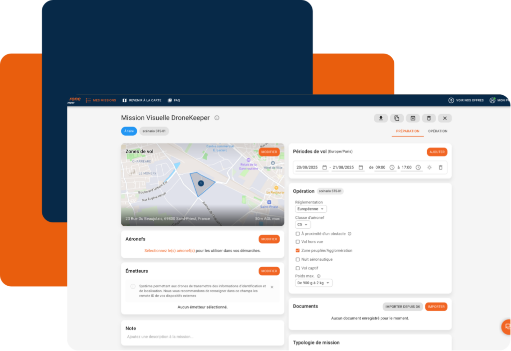 DroneKeeper centralise toutes vos informations réglementaires et simplifie la préparation de vos vols. Vous gagnez du temps, vous restez conforme et vous pilotez vos opérations avec une précision maximale.