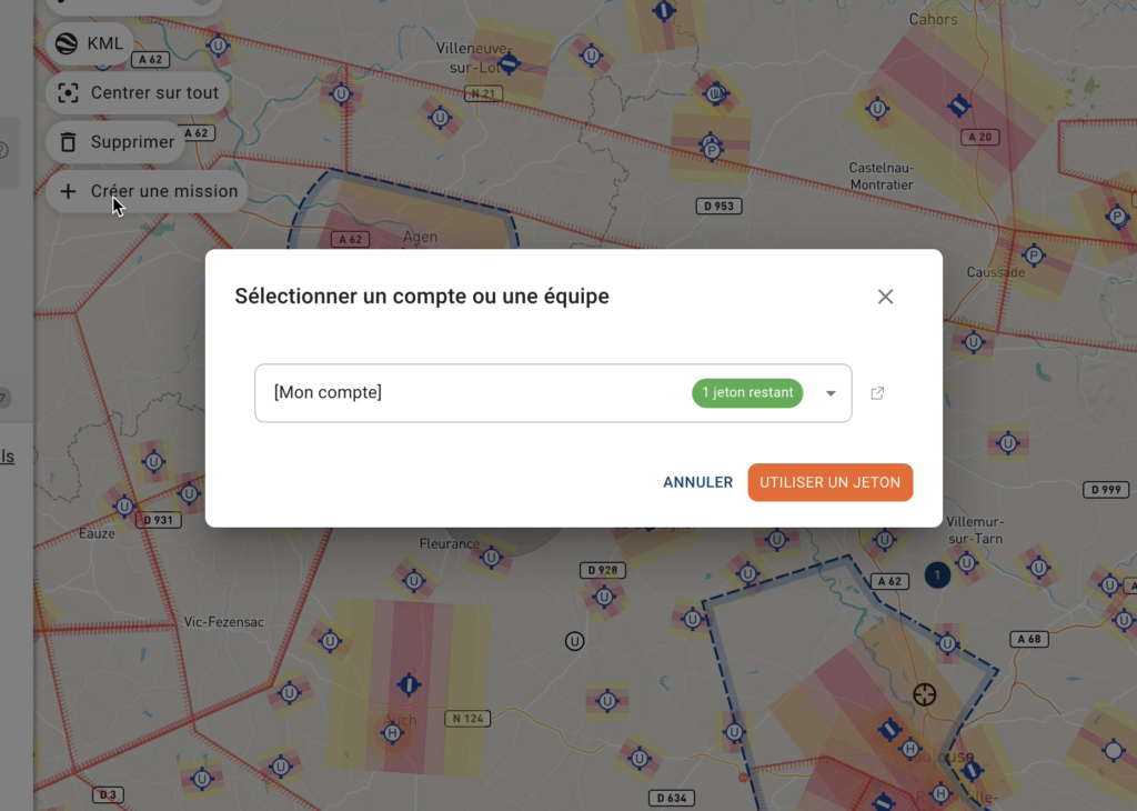Si vous n’avez pas d’abonnement actif, lorsque vous tenterez de créer une mission, l’option « acheter des jetons » vous sera proposée.